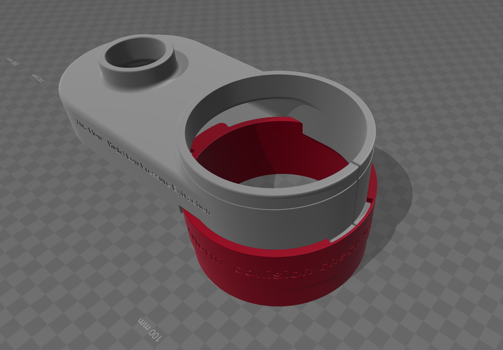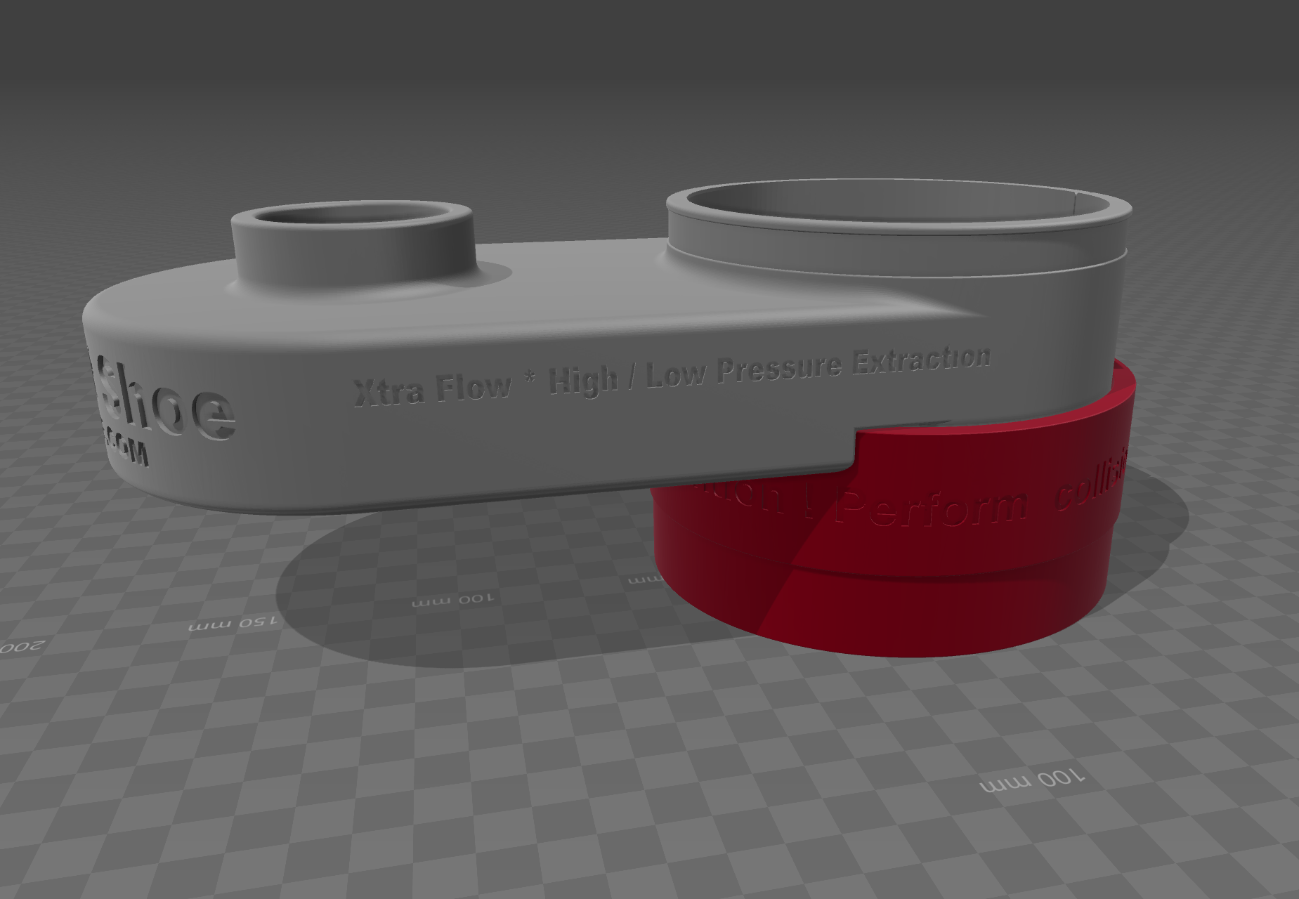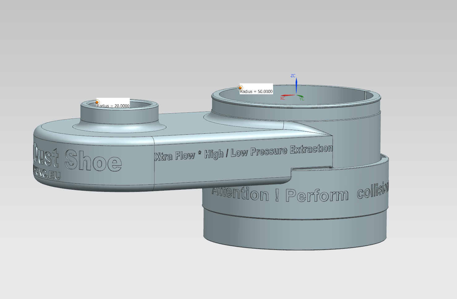 In short after about 10 prototypes and extensive testing i am happy with a model of a dust shoe that i use now on my machine. On pictures is seen for 100mm OD spindle and 40mm OD hose, but as i have designed it myself from 0, i can make and print any spindle hose combination you like. So its ideal for spindles to 100mm and to hoses up to 100mm.