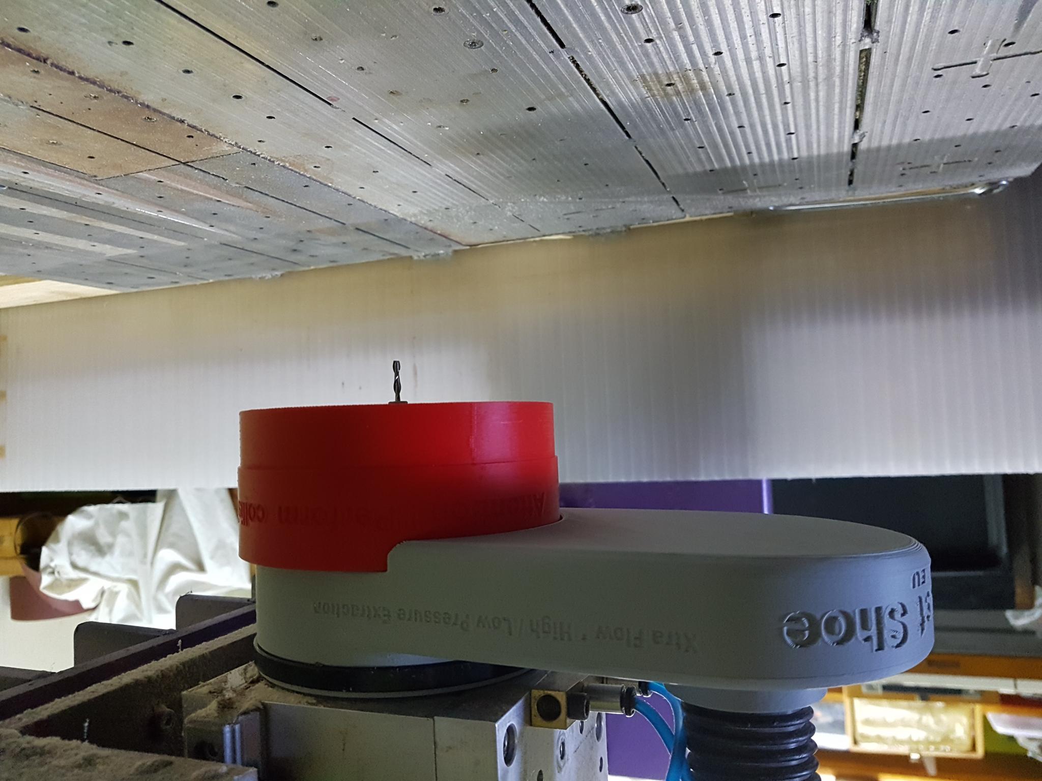However what i typically do at my workshop is exactly the opposite. I cut out a shape from a wood block which is raised on a vacuum fixture, so it could be said that this is the worst case scenario. As chips and dust try to escape from the clearance between table and work block. Hence when i designed the dust shoe i had always in mind worst case scenarios, not ideal situations from product videos