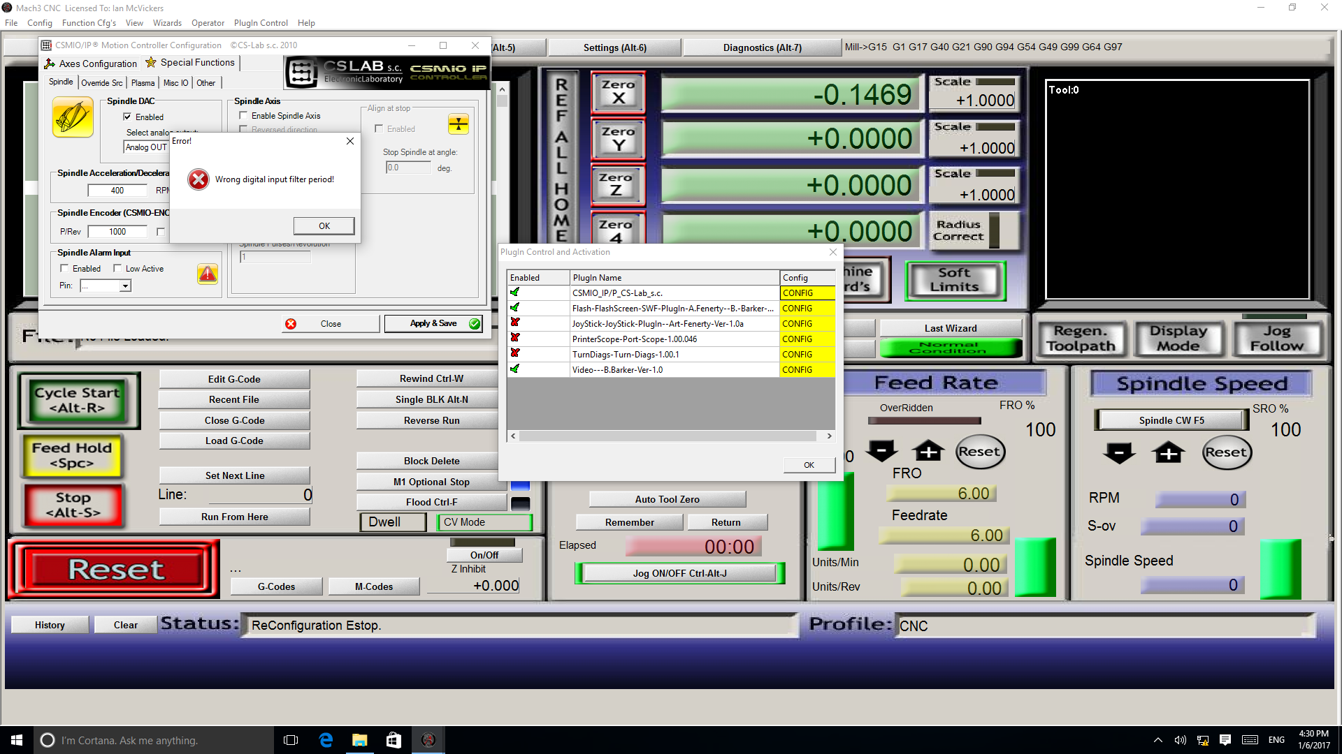 As for the "Wrong digital input filter period" I found out what causes it. In the MISC I/O tab there is a box for Input signals filter. If there is not a number in this box you get the error. Ive put in 2 and saved the settings but when I reopen the plugin sometimes it seems to have forgotten the number and gives out the error message again.