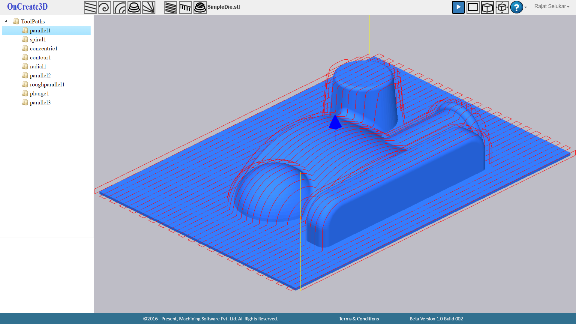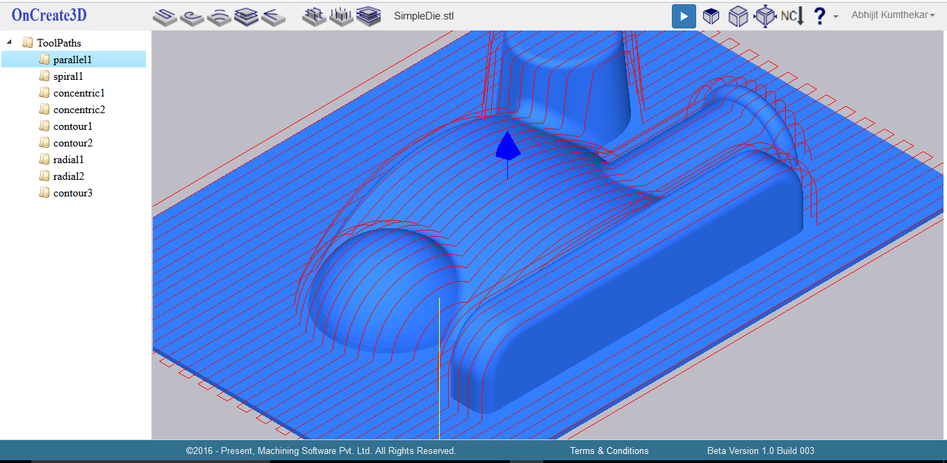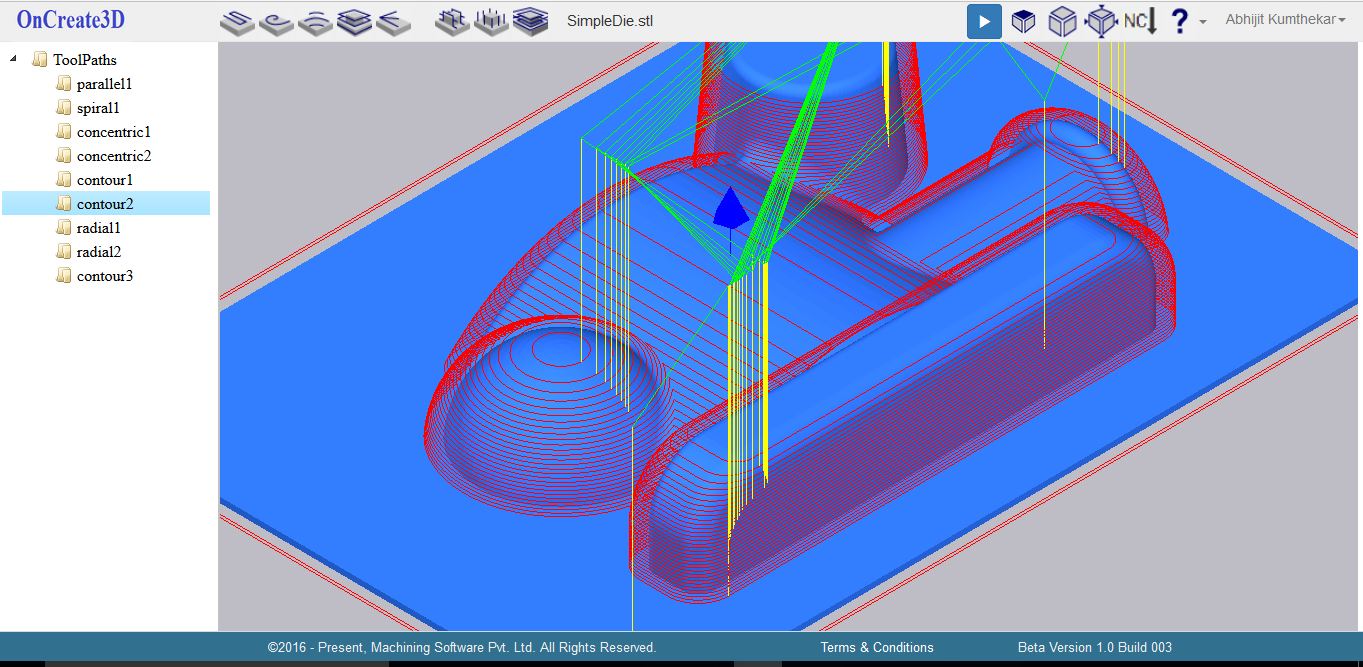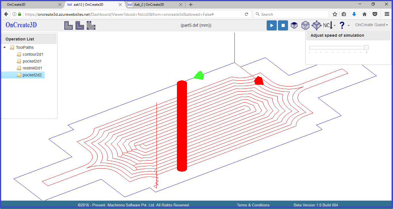 OnCreate3D has introduced toolpath simulation to visually check for correctness of toolpaths before downloading NC Files. You can play/Pause any time, you can speed up/down anytime. Although it is simple simulation for time being, we are working on showing updated stock after every operation. The feature is coming soon. Stay tuned.
