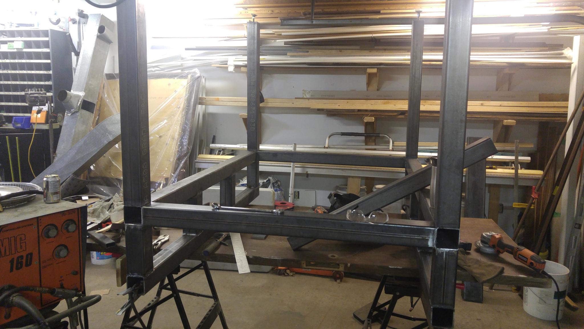 The frame is made out of steel because it is relatively cheap and I have the equipment to do it. The legs bolt onto the main table so that it can be moved. All of the welding and steel work is going to be done in my garage but once I have a rolling chassis it will be moved into my basement.