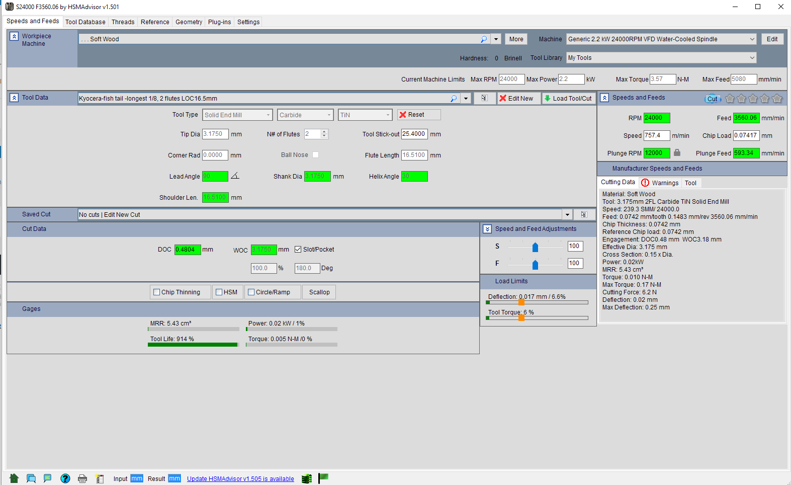 Cutting wise, ( wood ) I have been using 2.2KW spindle at 50% speed ( 12,000 rpm) or 18,000 RPM, and around 3,000 mm/min 4-5mm depth of cut.
