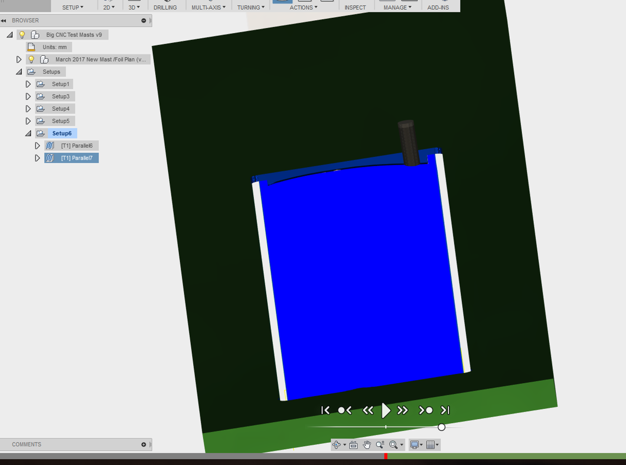 Question 1, Because the part is so long and thin, I have ruled out using a 4th axis to rotate and machine the part due to flex + vibration. I was planning on cutting 1/2 way through the part to the centerline, flipping over , placing in a female mould half with only the ends of the part ( off the end of what I need ) bolted down, and then cutting the ends off after. Alternatively I could make a channel in the female mould, connect my kracher vac and try to vacuum hold the male piece in the female mould for final cut. ( with some guide lugs off the end to position accurately ). Any more tips or other methods that may work to get the basic shape done.