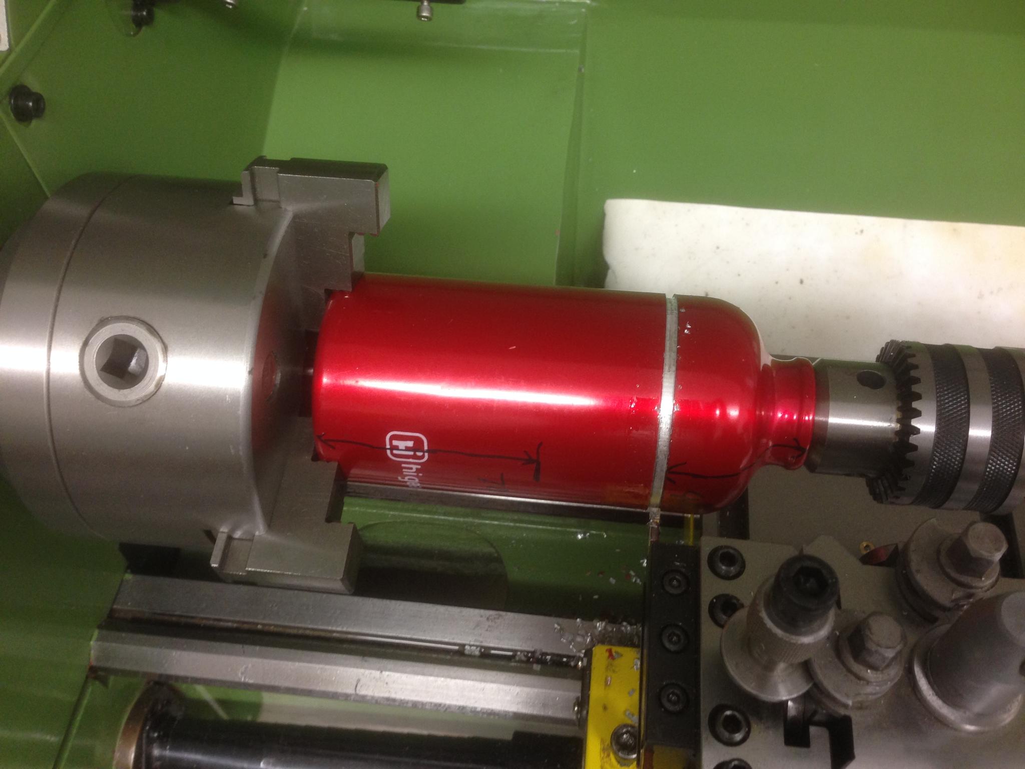 I cut the base down to ~70mm using the parting tool to get the cut going then finished off with a hacksaw, and then finally I used the normal LH cutting tool to tidy the edge. The bottle is very weak during this bit and it kept moving away from the tool, plus it jumped out of the jaws more than once so be careful. No photo of this bit.
