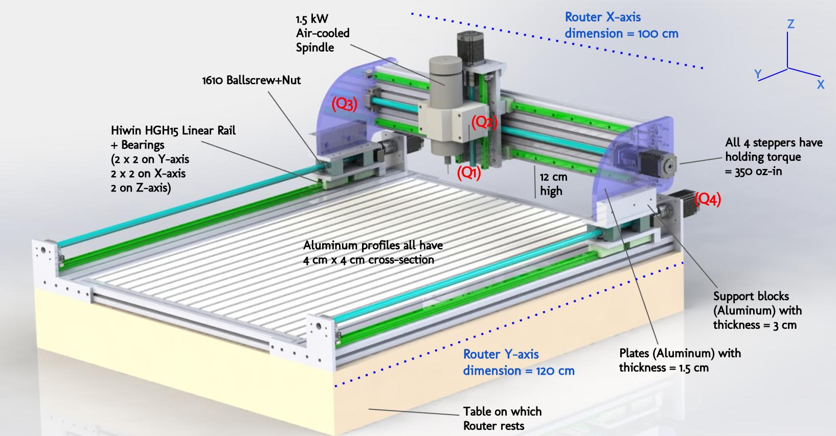 - (Q4) Steppers: 350 oz-in. Are these going to struggle with moving the amount of weight all the parts add up to? I am mostly concerned about Y, even though I have dual-drive (i.e., two steppers) on that axis. I don't need too much speed even on rapids, as this is mostly for occasional personal use. I do want the router to run without skipped steps obviously.
