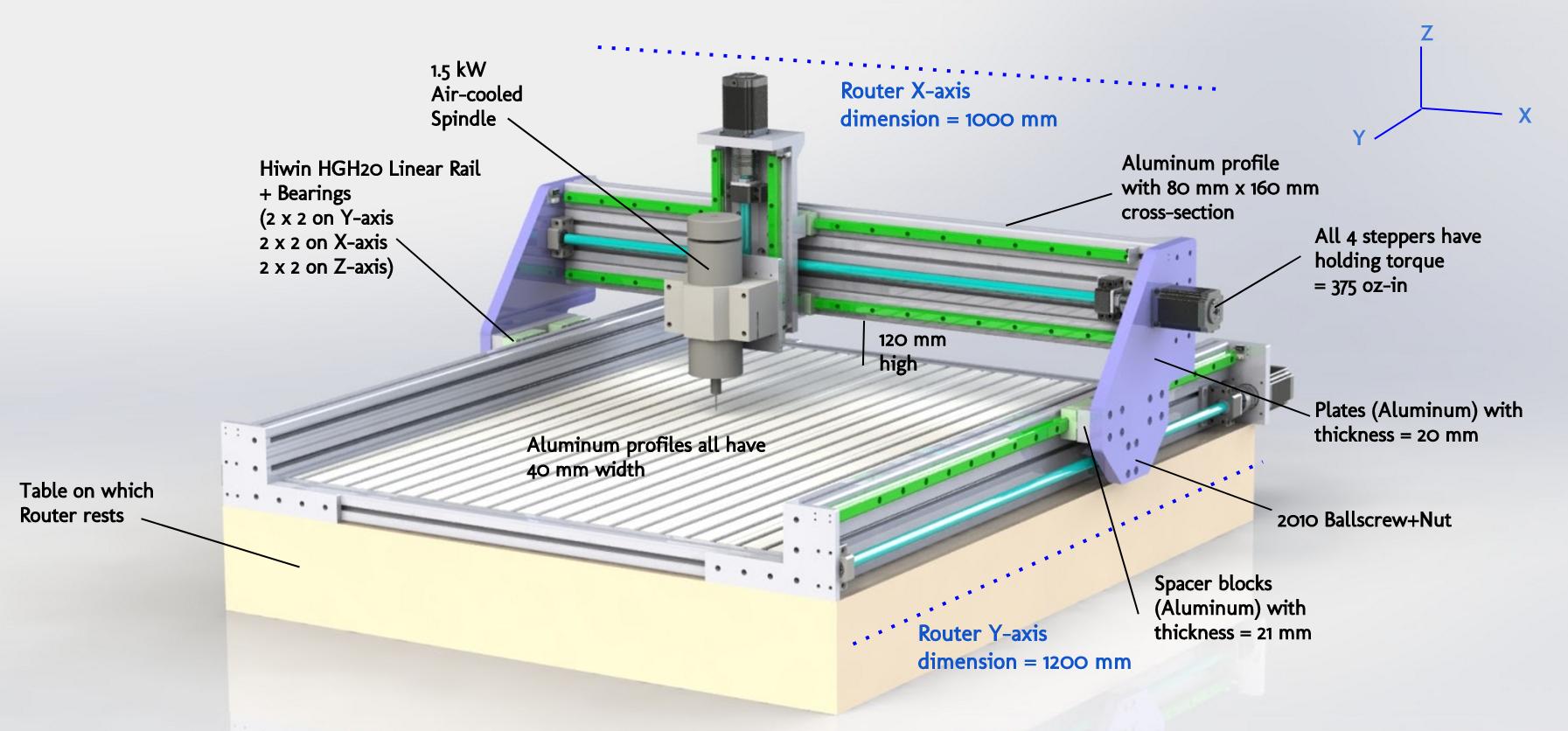 - Strengthened the X-axis (i.e., the horizontal "gantry axis") by using 80 x 160 mm aluminum profile instead of 40 x 160.