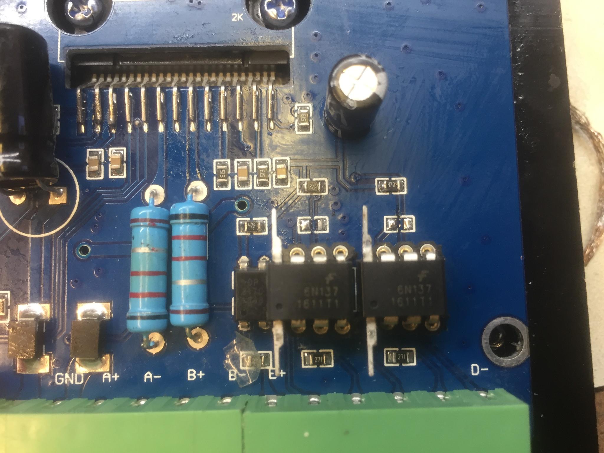 Here, you can see that I've remove the 2 6-pin Opto Isolators (lower-right) and the two base-pulldown resistors (just above each opto isolator). I've soldered in 2x3 pin SIL headers for each opto-isolator to accept the replacement 6N137s.