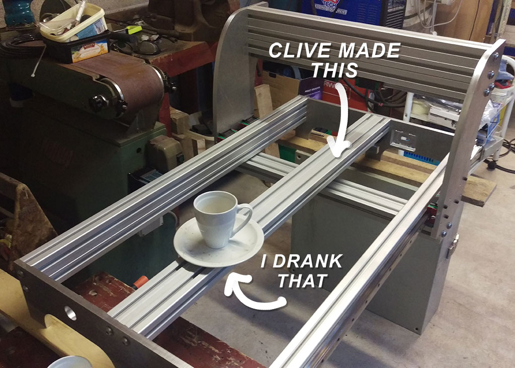 Over the last few weeks I've been hanging out in Clive's garage after taking him up on his offer to help me cut the larger plates and assemble a new router to compliment the mini-mill I built a couple of years back - that machine's still going strong and I'm making some good work with it, but I really do need a bit of extra cutting area (my ultimate goal is to build my own bass guitar from scratch - despite already having eleven of 'em :pig: - it's a big part of getting into the whole CNC thing for me).