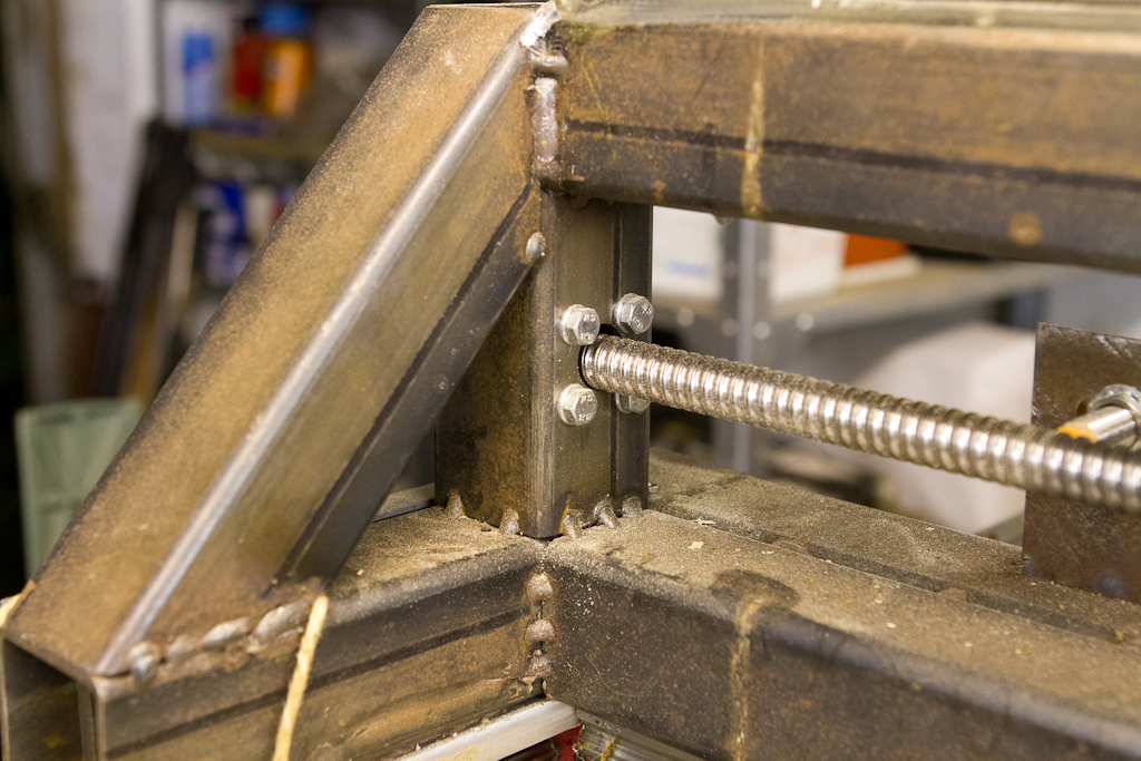 As described in the intro, I used 3mm wall thickness box section steel throughout for frame and gantry, with a mix of 50x50 and 100x50. The frame is pretty straightforward. I found that steel has one brilliant advantage over aluminium extrusion – it is remarkably forgiving. The combination of angle grinder and MIG welder (I’m not clever enough for or could justify TIG) means that building the frame is not difficult, and in particular those two tools will also deal with the odd mistake. Chop and reweld to your heart’s content. What I did realise, after the event, is that I should have spent a lot more time jigging and clamping and aligning before welding. Obvious to the more experienced out there, not so obvious at the time to a beginner with a welding torch. Close scrutiny of any of the welds will indicate my lack of ability, but fortunately it seems that a strong enough weld does not have to look pretty. In many cases, I welded as a series of “spots” as I had found that there was more tendency for things to move if I made continuous welds, and what I have done is probably good enough.