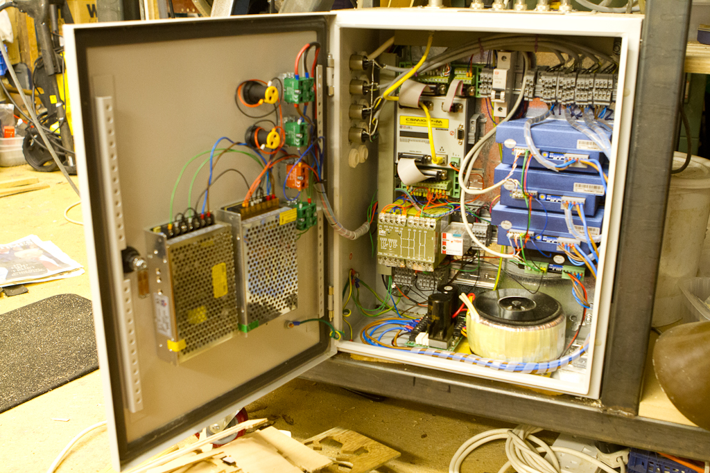 The control box uses EM806 drivers running from 68V linear PSU for X and Y, and a recycled M752 for Z – less critical than X and Y, and not needing the stall detection which (in my view) is absolutely necessary for a dual-motor axis such as mine. There is a CSMIO-IP/M motion controller, plus Pilz safety relay and the usual odds and ends. Limit switches are inductive, NPN NC, running off 24V.