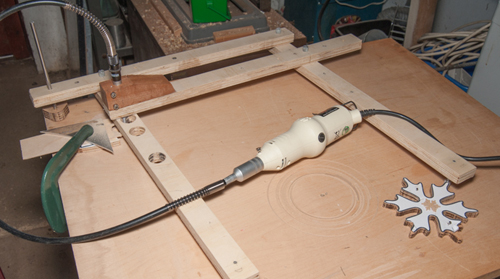 Rosettes are currently cut with a Dremel on an adjustable radial arm which rotates about a fixed pivot at the centre of the soundhole.