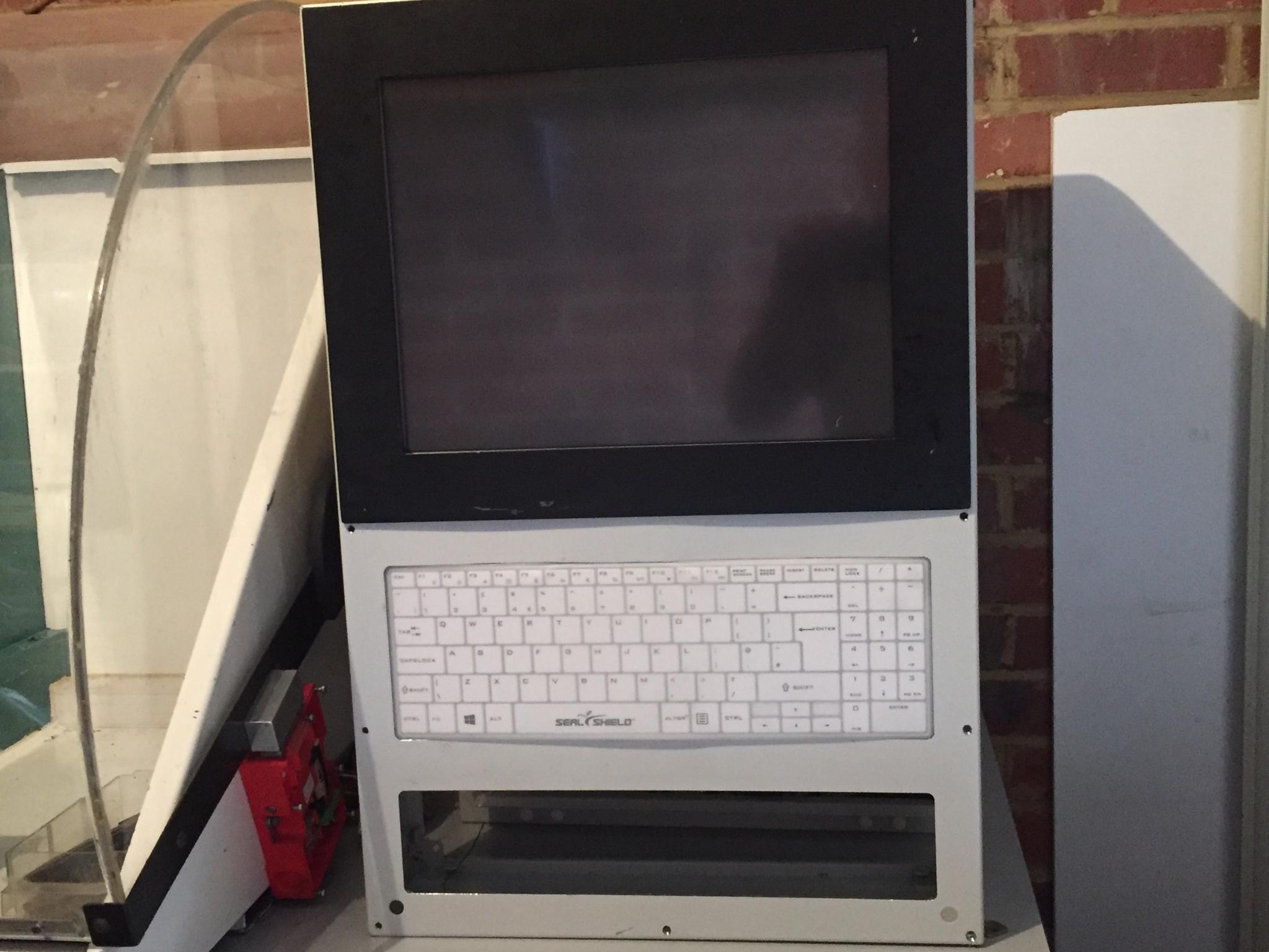 I’ve made a start on the operator interface. For this I’ll be using a 17” touch screen monitor and a waterproof keyboard. The aperture at the bottom will house the start/feed hold buttons, a feed override pot, and a spindle load meter.