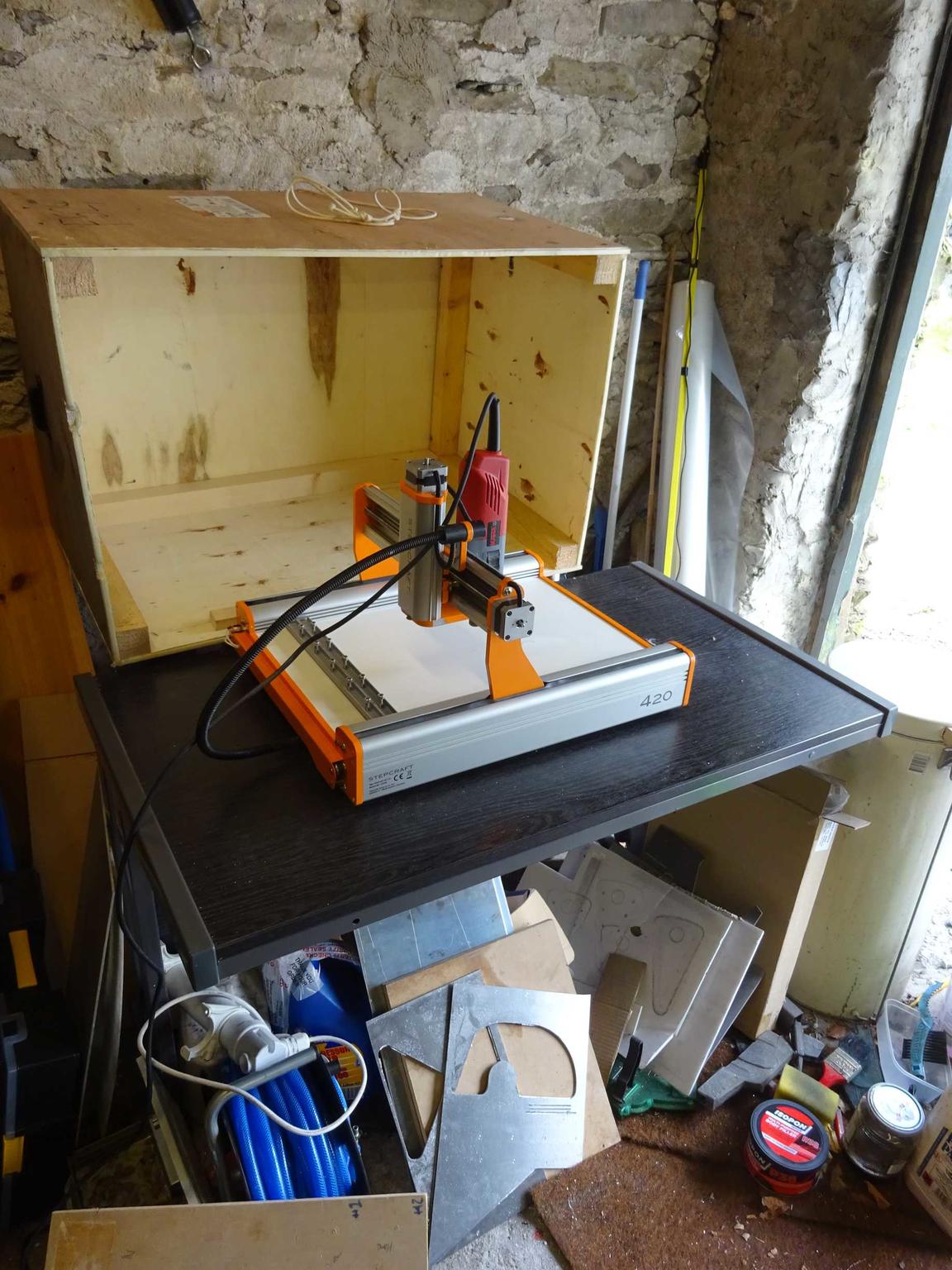 Stepcraft S420 (~A3 sized) desktop CNC router. Fully set up and working with a PC running Mach3, an upgraded spindle (Kress 800), basic tooling (collet and 1/8" end mill and 3mm drill, all I needed!), and a table with homemade quietening box attached to it.