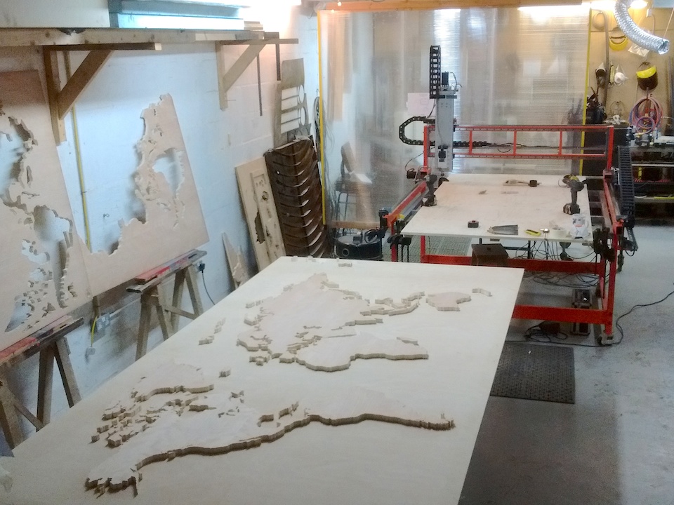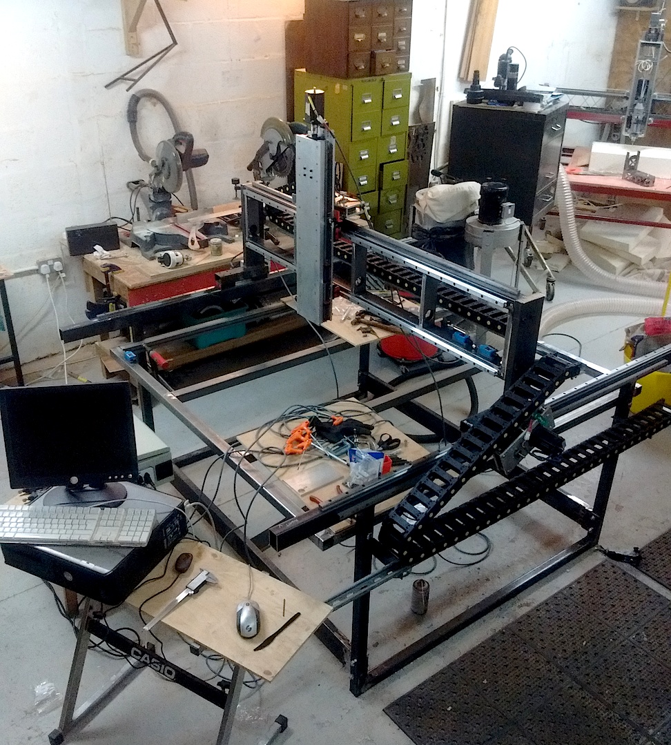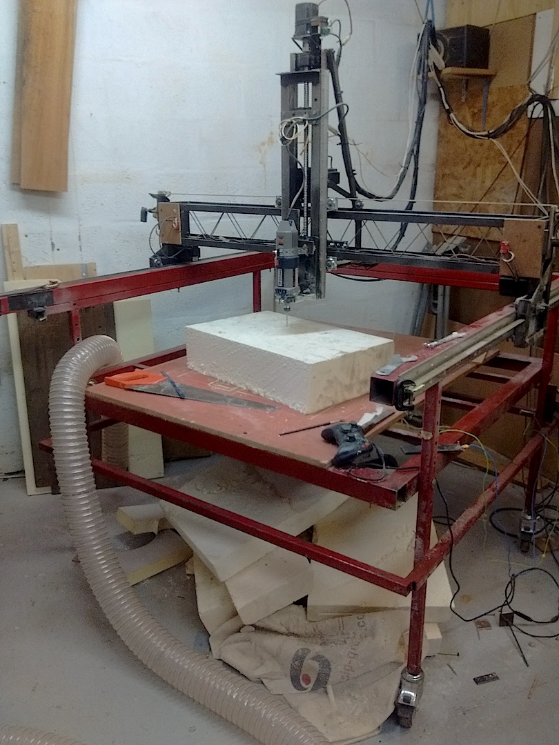 The machine has a work area of 1500 x 1300 x 450 with a workbed I can raise and lower depending on the material volume. You can see the same principal in the machine in the background. The design will allow me to work right round a 1200 x 1200 x 500 block of foam for prototypes using a BC head.