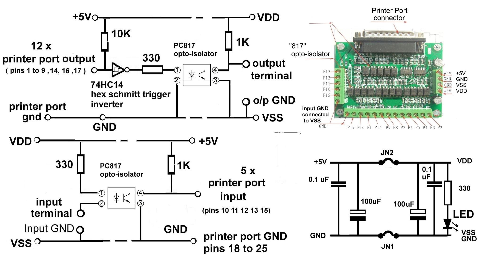 these two BOB's only buffer the printer port outputs and only opto-isolate the 5 inputs -