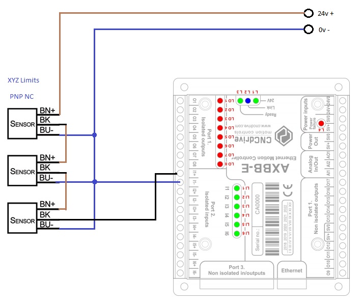 I have PNP NC switches so I believe I will need to wire in series for the limits to trigger. I want X, Y and Z all on one input for the Limits and I used normally closed as I believe they are safer as if a circuit is broken it will trigger the input.