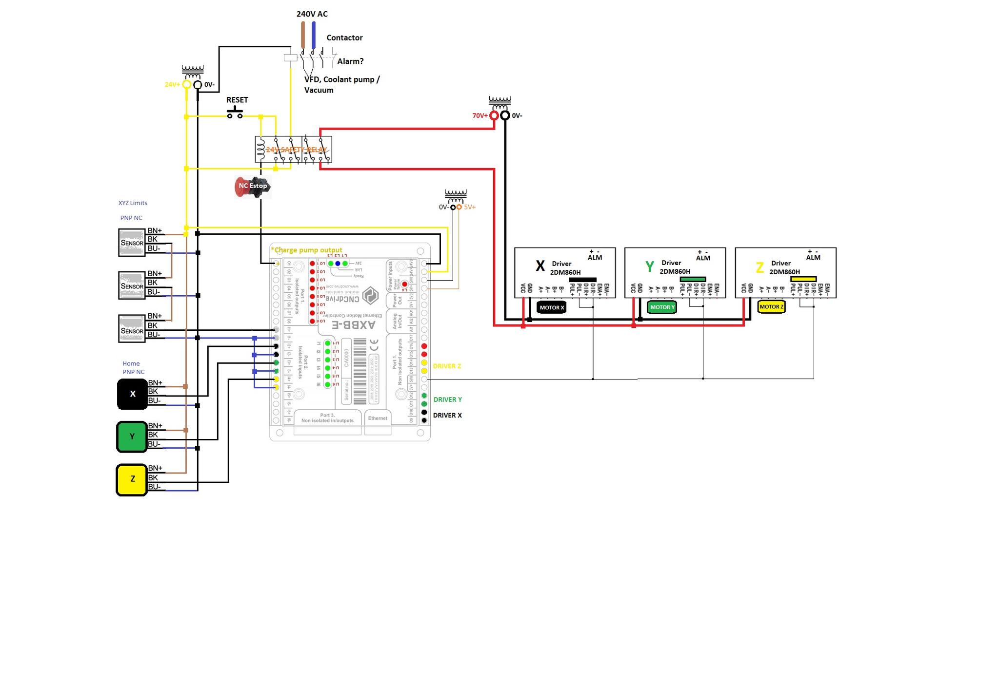 I have the charge pump output of the AXBB-E to a NC e-stop switch then into the 0v- relay with a momentary switch latching circuit on the positive side going to 24v. Then one pole powers the contactor to switch the 240v to the VFD, Coolant and Vacuum. Another pole connects the 70v side of the toroidal transformer to power the steppers.