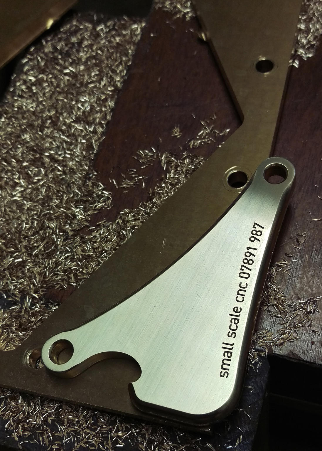 I had a stack of brass plates (with a diamond shaped hole cut out the middle along with 8 fixturing holes) left over from that recent plaque job - I thought about weighing them in, but for the few quid I'd have got I decided I'd make something - chunky brass keyfobs/bottle-openers. I'll likely give a few away for promo purposes and maybe make a bunch which feature smarter artwork, which I'll try and sell. Dunno yet. I've got enough material for 60 of 'em...