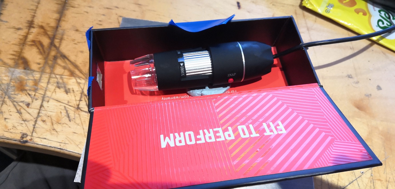Anyway I figured a webcam and a bit of custom software could do better. I put together a very crude test using a usb webcam (actually a microscope but that isn't relevant). The webcam is placed in a box to shield it from stray light and a small window is cut in the end of the box. The window is 'glazed' with a bit of white paper to act as a screen. The webcam is focused on this screen.