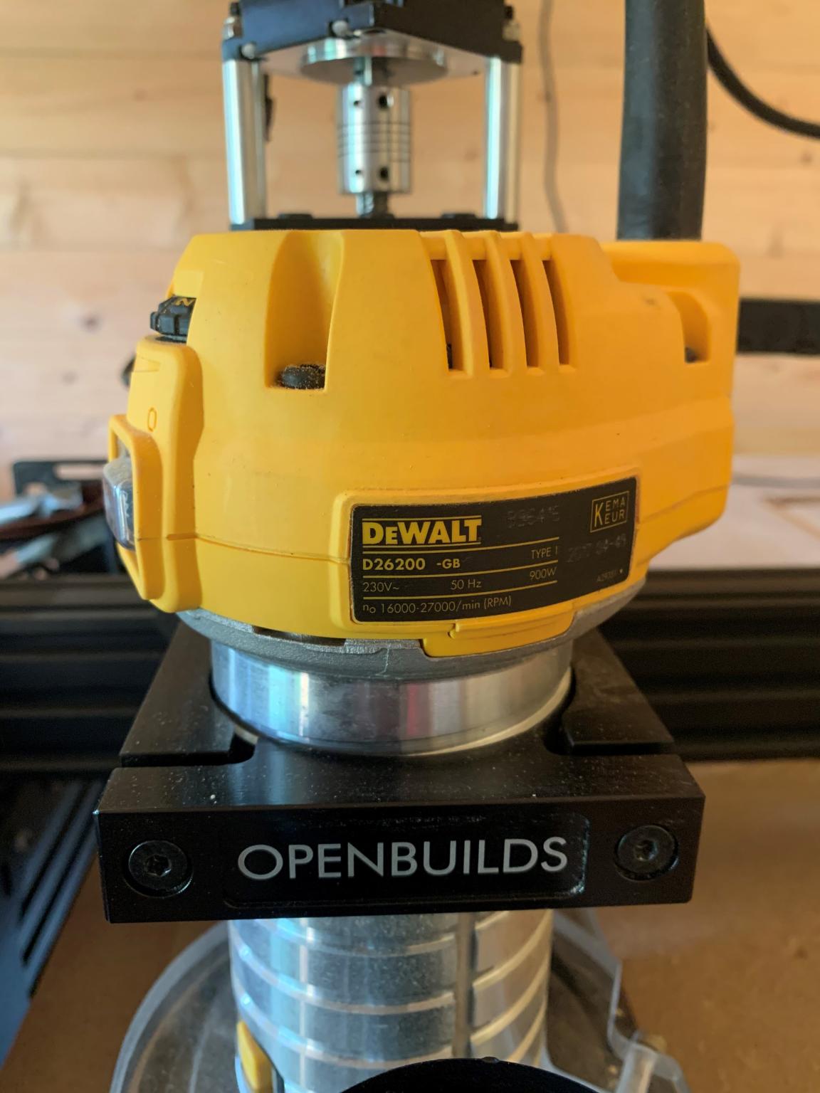 Included is a dewalt D26200 router + a dust shoe (https://ooznest.co.uk/product/cnc-dust-shoe/)