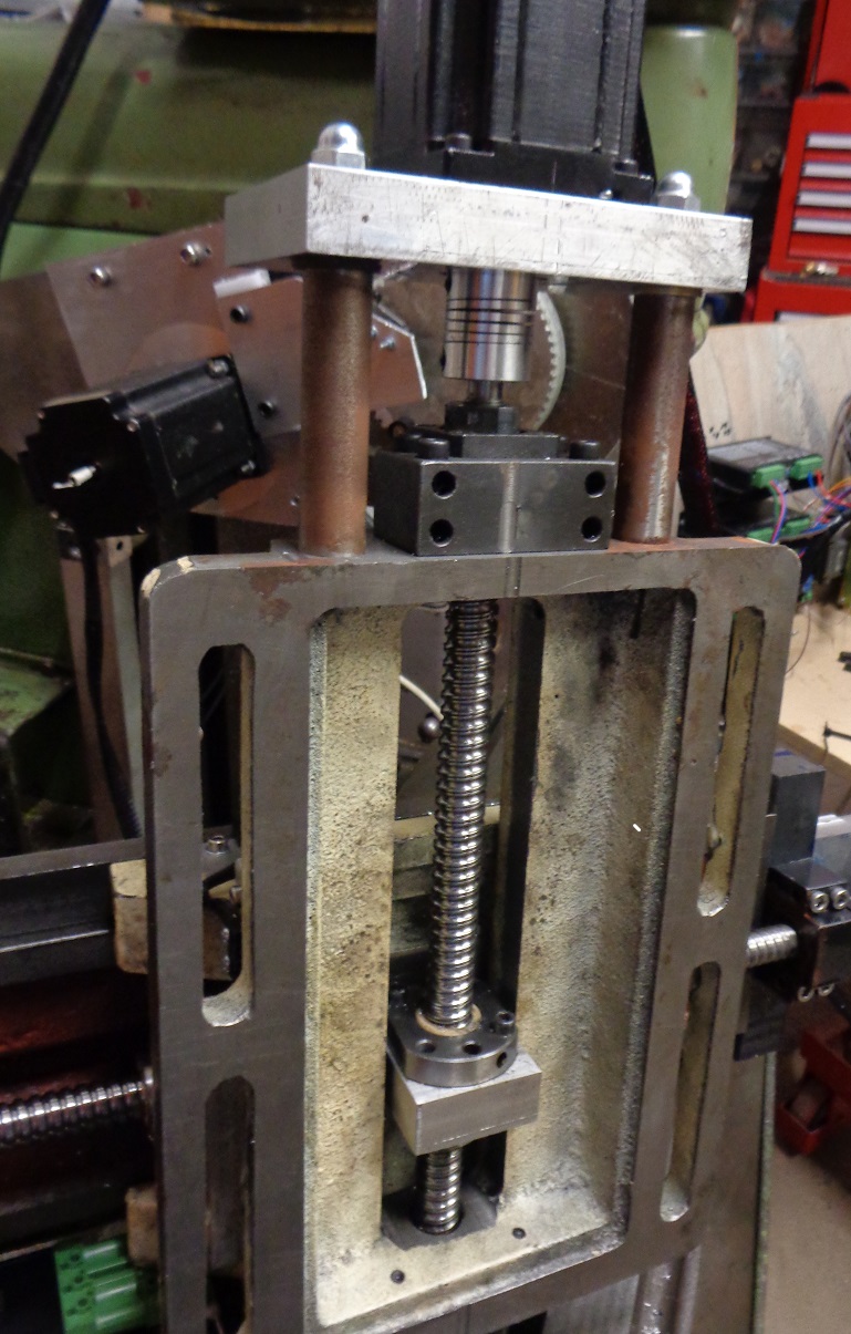 The arrangement of the ball screws and bearings turned out to be very simple and very much in a similar style to the original screws and mounts , and I was even able to recycle the old bracket on the table end . My first attempt at mounting the x motor did not take into account the endfloat in the motor due to spring thrust washers. When first powered up with a cordless drill there was significant back and forward shift. Plan b involved a steel block mounted to the end of the table to give a seat for a fixed bearing and also to give a fixing for the motor mounting brackets.
