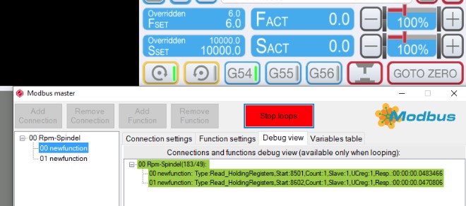 The macro loop monitors the buttons and places (in my case) 129 (CW), 133 (CCW) or 136 (STOP) commands in Modbus registers, together with the spindle rpm. My recommendation is that you keep it simple and initially you only try starting and stopping the spindle. Take the next step when you understand how everything is working together.