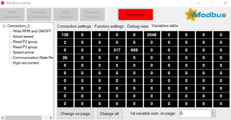 It looks like you are only reading registers, not writing (sending) any commands to the VFD register which controls start and stop and the spindle speed. I include pictures of my Modbus Master screens, yours should look similar regarding start / stop and spindle rpm command. Of course, register numbers don't match, so you can't just copy mine, but as you see, I am writing to a register for on/off and rpm. That process in my case can be done in one commend, or two if I wanted to, but I do it in one.