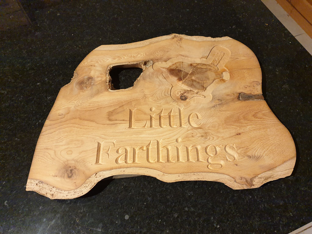 Nothing quite so fancy, but this was an interesting project. A neighbour wanted a sign for his new house which was going to have the same name as the one he had lived in as a boy. His father, a wood-turner, had left various lumps of timber including a very well-seasoned piece of yew. He also had an old brass nameplate off the old house which had a cast impression of the wren from the old farthing coin. Could I make a sign out of these, incorporating the wren as a 3D carving?