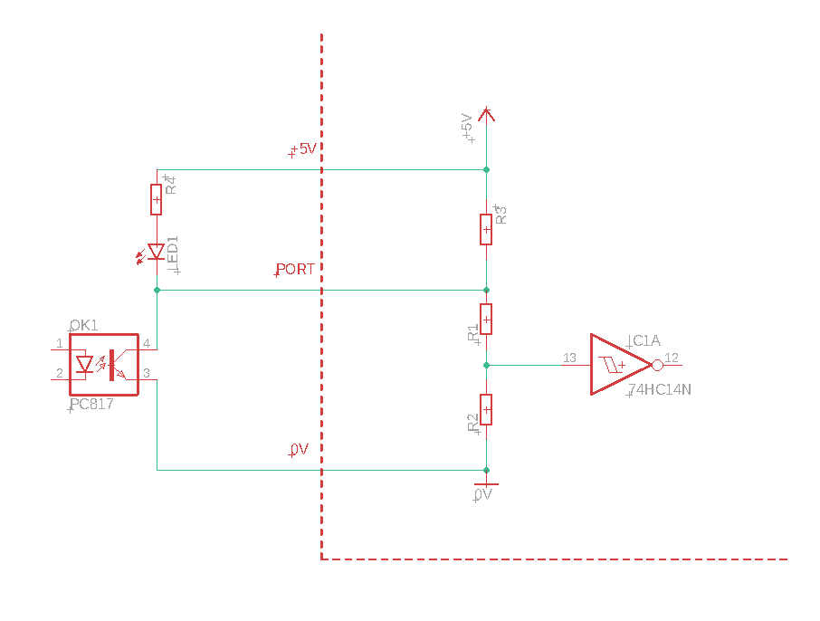I am not sure this is right. The UC300 uses 5V logic, not 3.3V. Pin 14 of the HC14 is directly connected to pin 26 of the IDC connector #5 where the 5V output is (I just measured). Why would there be such weird voltage divider on the input? Also, the manual clearly says: "All output pins are TTL level with 0/5Volts output Voltage levels and an absolute maximum of +-20mAmps current per output channel. All inputs are TTL compatible and accept 0/5Volts Voltage levels."