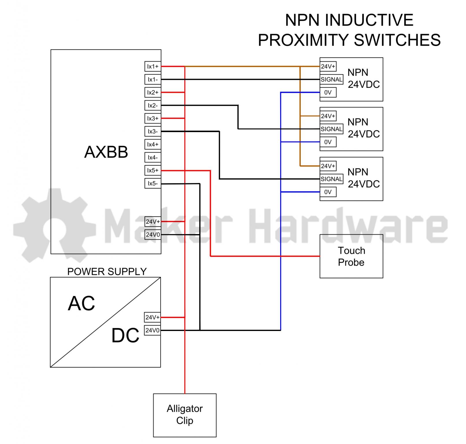 You've not indicated your grounding strategy - and maybe you don't know if the PSUs internally bond their 0V to chassis ground (I'd expect them not to) but that can be considered as an electrical noise management strategy. My concern would be the 24V alligator clip floating about - that PSU looks like it can deliver a whack (and an unexpected spark can lead to comedy flailing of limbs near a machine capable of eating your arm). I'd be looking to current-limit the alligator clip. Not by a fuse - that's not the point here - but just with e.g. a series resistor mounted within the box. The AXBB instructions give you hints here - the inputs have a series 2k2 resistor ("which limits the current into the optocoupler.... function between 10 and 30Volts...") which gives me great confidence that you could place a series resistor within your control box of 1K and not worry at all about the influence on the probe, but you've limited the "fault" current on the flailing 24V line striking a grounded bit of metal to 24mA by doing so, and protected your 24V supply in the process.