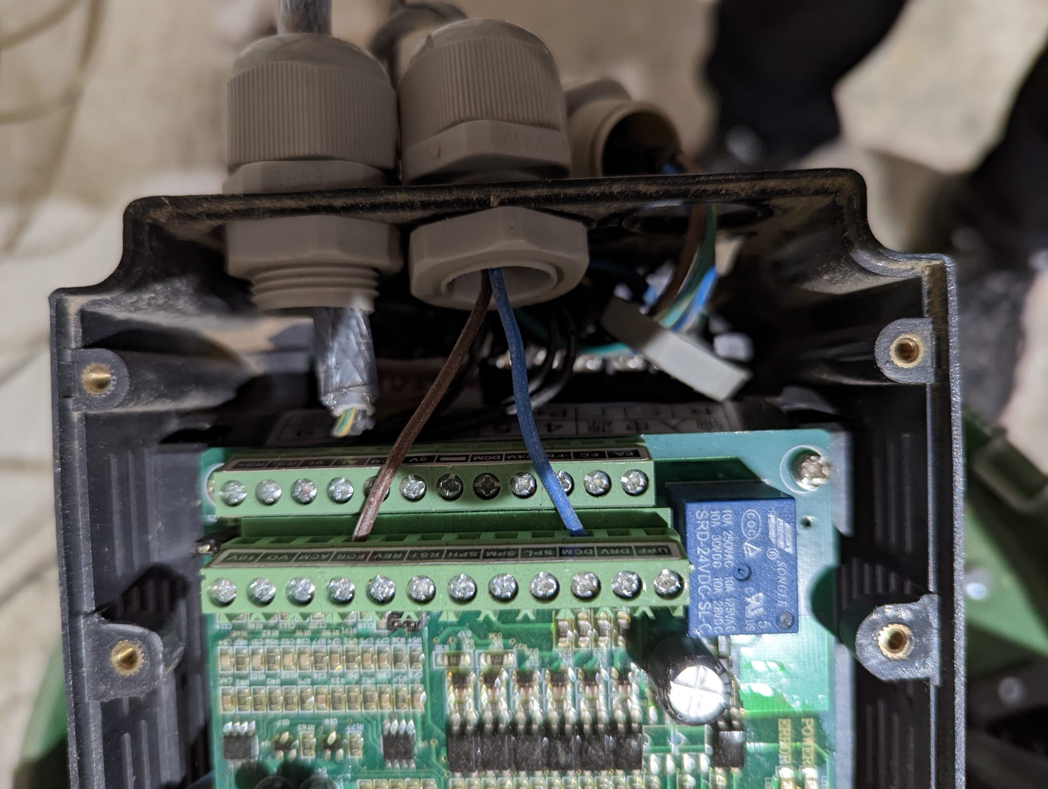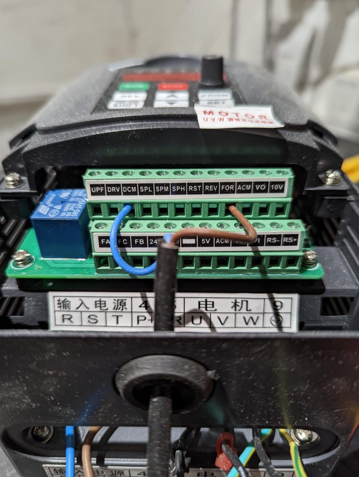 The part that's confusing us...aside from it not working....is that all the googling we do, makes us think there should be at least a third wire going to the top line, and not just the blue 'n brown coming from the control board (which runs to a relay and effectively turns the unit on and off it seems) so we don't understand how MACH3 was able to control the spindle speed in this set up, and can't find any references to a set up like this to guide us.