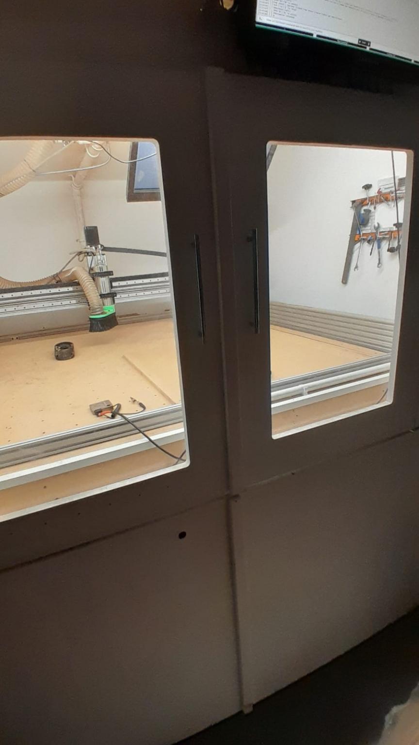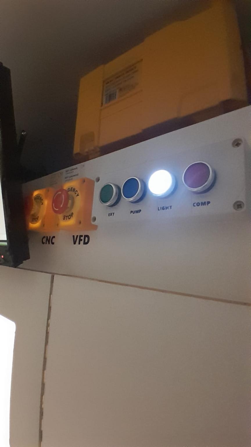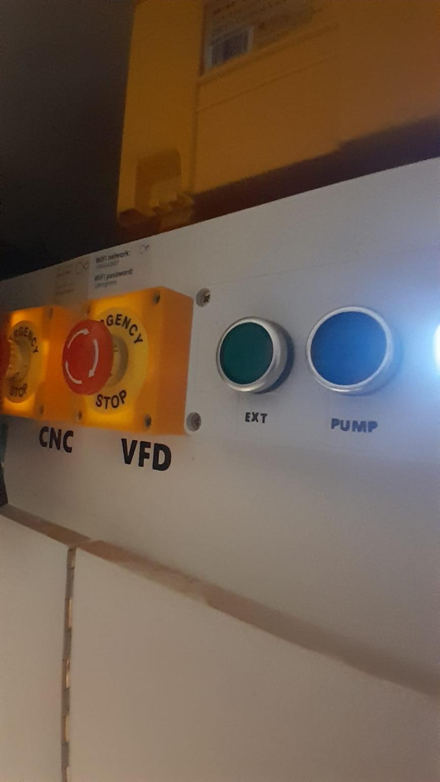 6 A custom control panel which i built to have easy access to turning on everything. It has two emergency stop buttons, one for the VFD and one for the CNC, plus coloured extraction/light/water pump/Compresser buttons.