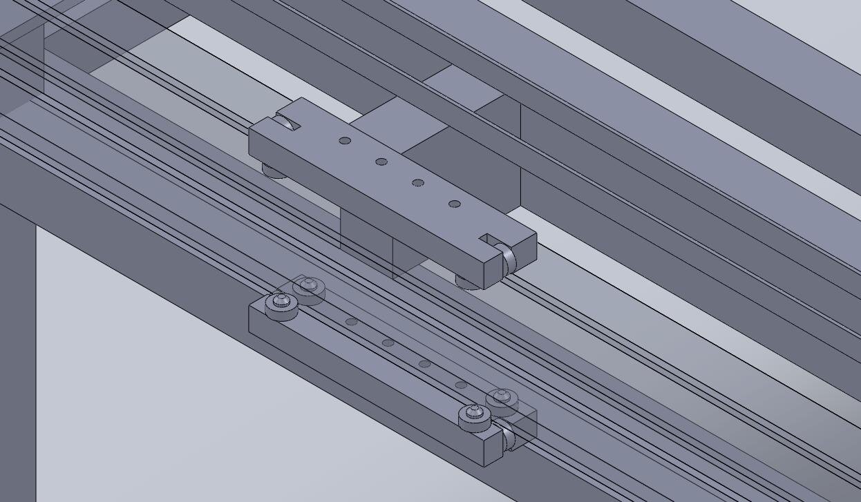 Firstly the carriages have bearings below. The carriages are mounted to flat bar, there are 6 bearings in total in each carriage. Full details are available at www.cncrouterparts.com.