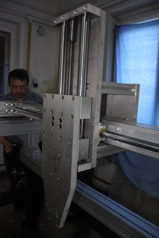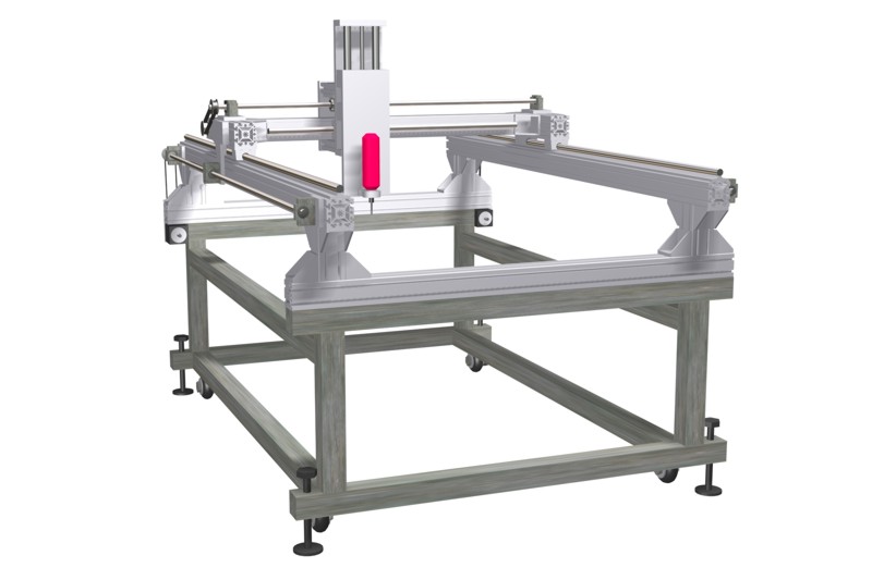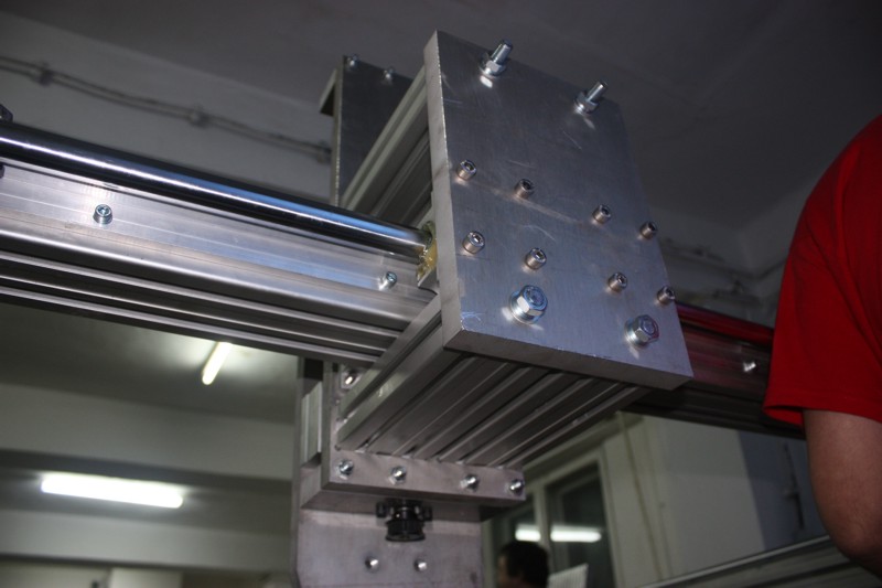 The design is very solid, as it is using 90x90 heavy profiles from Bosch, with centering spring pins and threaded bars stiffening on all the connections. Actually I used this design exactly for improving work access and increased stiffness. Then, there is a slight controversy about this design: if I was to use a clasic gantry, then the deflection caused by the height of the gantry, would need to be compensated (because of much higher moments) by a huge gantry thickness, which would increase a lot the weight of the mobile part. So, I preffered to increase a bit the weight of the table, and keep the gantry height at minimum. Now, instead of having 2 poles on the side of the gantry, with limited thickness and weight, I have 4 much heawier poles, with all the possible reinforcements, and on a much larger base, holding the X axis.