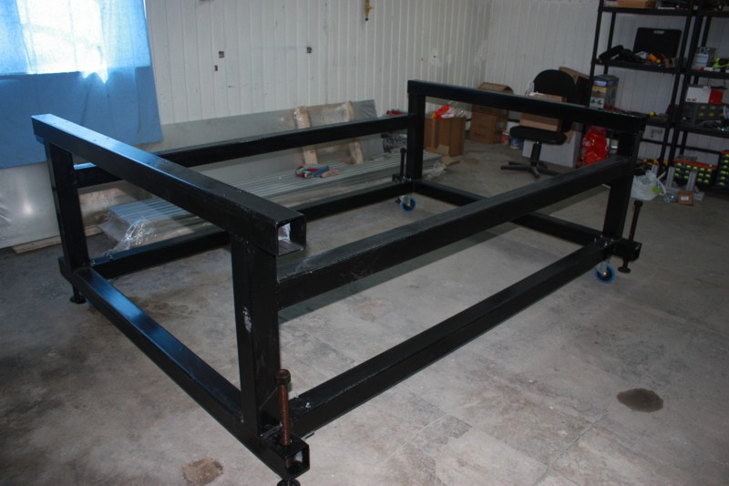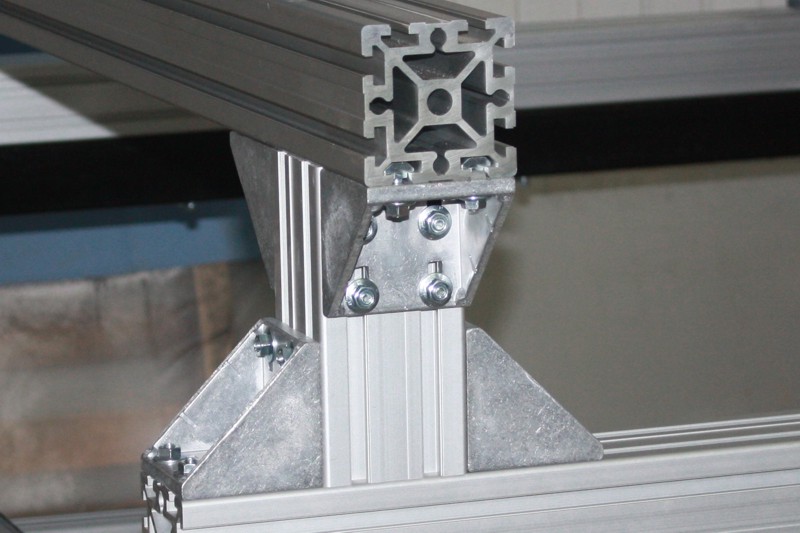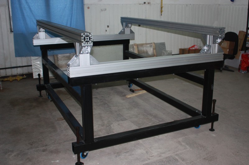 Aluminium profile structure, 90x90 mm, heavy. Support assembly made of steel rectangular profile steel 80x80x4, on castors and support bolts.