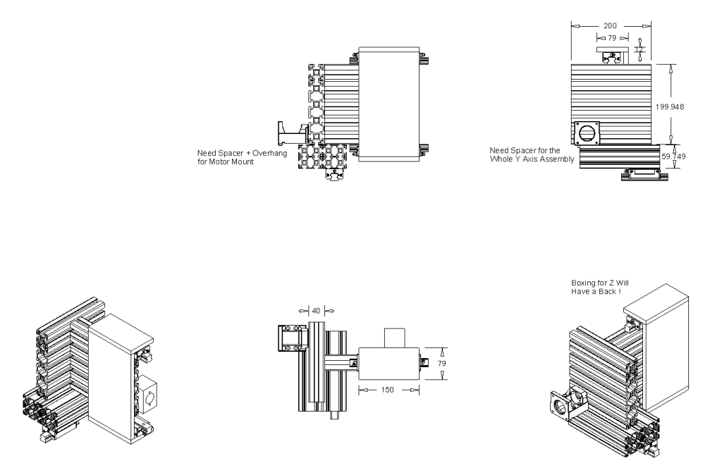 The breaking point came when I tried to figure out how to join the X and Y and Y motor: bolt the Y to a plate oversized to match the spacing of the X and make a sticky-out bit for the motor housing and another to support the base of the Y span. Combine this with spacers for the X gubbins and the fact the Z box thing needs to be plate to keep the overhang down and, well, that makes quite a lot of plate already, is it really worth continuing with the profile?