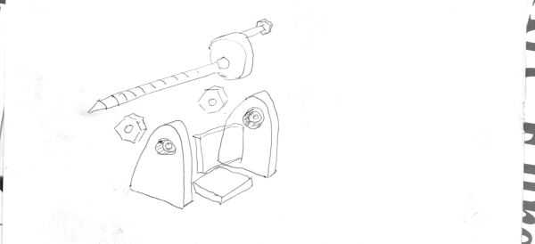 Two bits of MDF for the uprights, counterbored to take two nuts thwacked in, base, upright spacer and a sharpened length of all thread for the spindle.