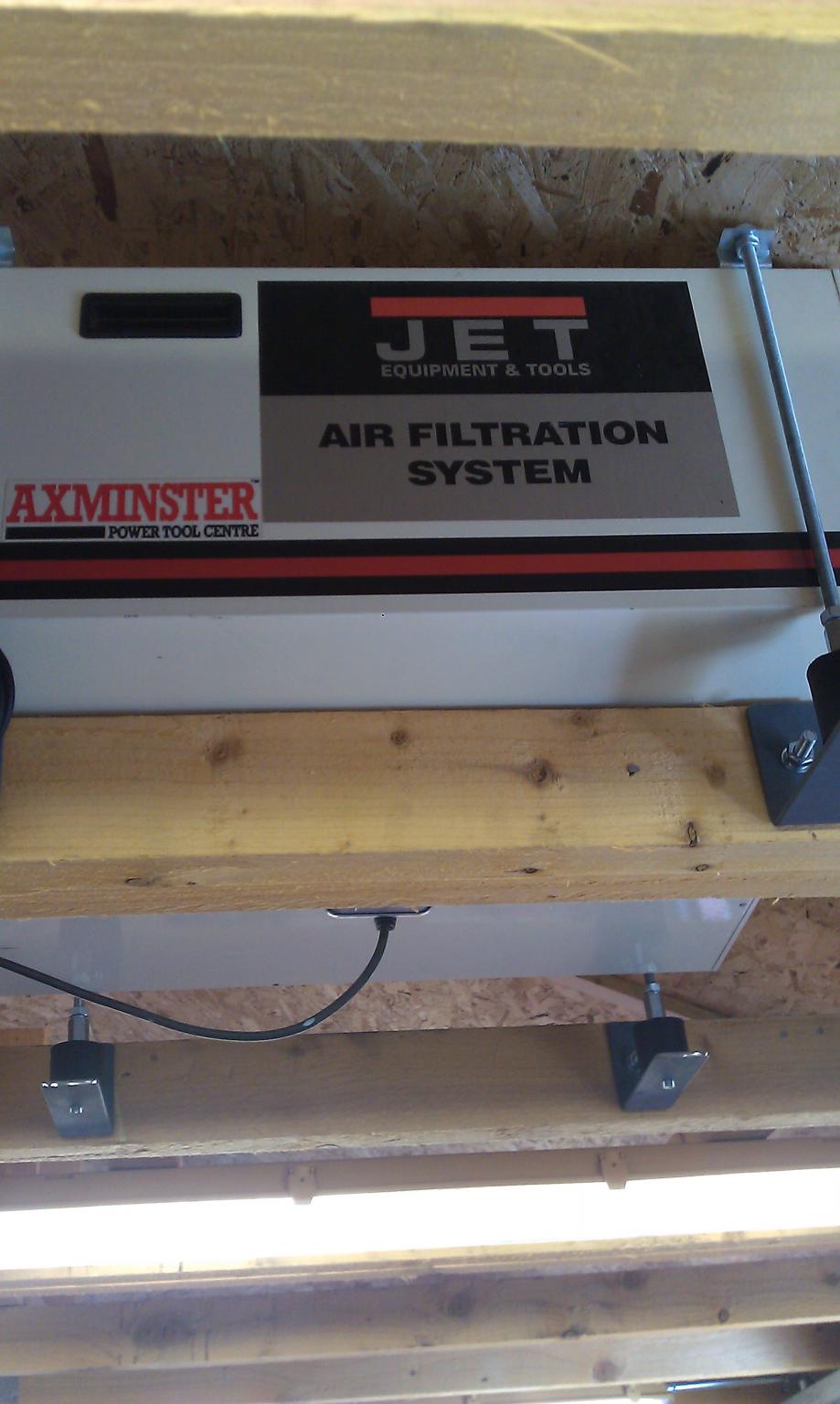 Photo of my air filter installed in the roof space above my wood lathe. These are good for collecting all the dust that the extractor misses.