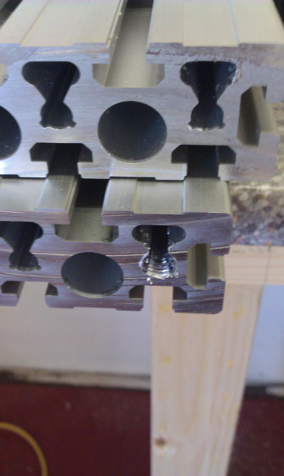 KJN and Hepco do a series of self tapping 'core screws' for their extrusions. http://www.aluminium-profile.co.uk/a...ore_Screw.html For the 45 X 45 I used, the central 'hole' is 10mm but it is not a 'plain hole' ... more like a star washer. I used 12mm dia and about 30mm long with a size 50 Torx head. They are designed to join profiles together at 90 deg. To build a T, you would drill a 10-11 mm hole through the centre of the cross piece, the screw is slid along the lower slot of the cross piece until the head is visible through the drilled hole, bring up the vertical extrusion and the screw is screwed into the central hole. The Torx bit being inserted through the drilled hole. A very secure fixing but if the end of the extrusion is not absolutely square then the 'joint' will not be.