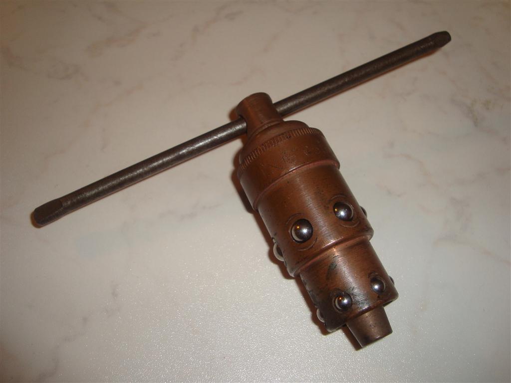I got this at an auction in a box of more useful bits. Looks interesting but I can't think what it's for. When the handle is turned the taper is pushed via a the thread again all the bearings, so they're pushed out. Maybe it's some sort of clamping or measuring device? Although doesn't explain why it's all solid copper! It's inscribed with 1" X 1.25" and a patent number which I can't quite read unfortunately.