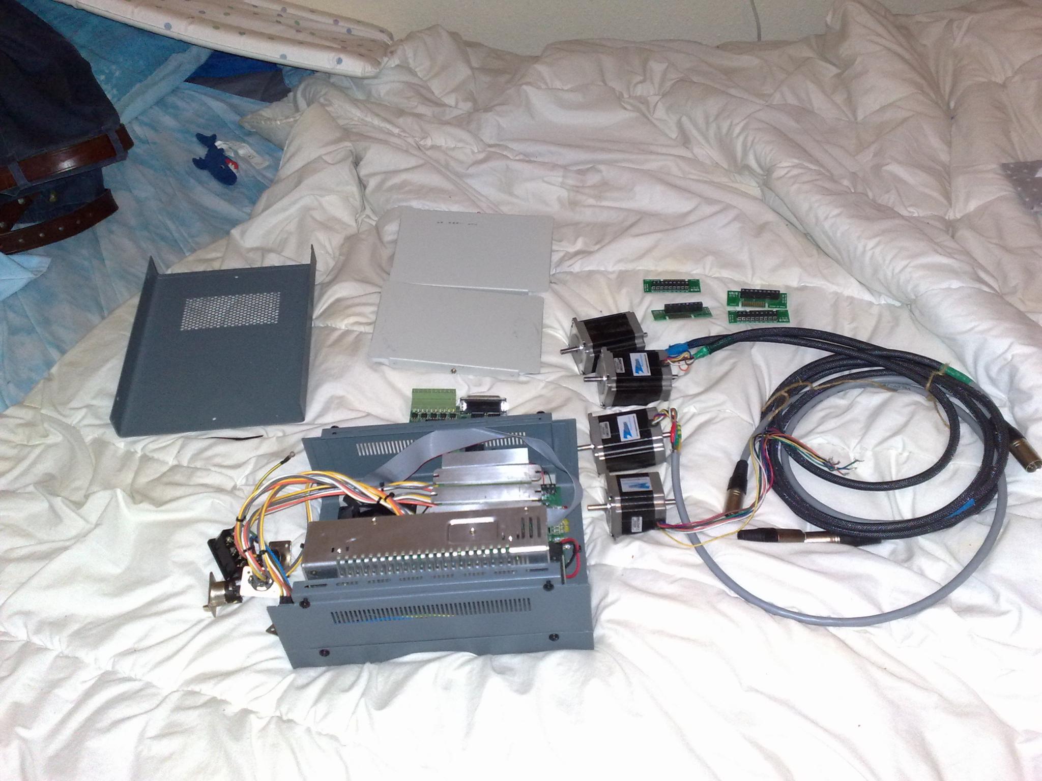 1) DIYCNC System 4 set up and tested for dual X axis with 4 nema23 1.85 motors already wired in parallel with the 24V powers supply mounted in it already. New unassembled costs £421 plus postage. Also with this are 4 ext mod boards for running drivers from the board and independent power supply ( they price at £4 each) they are wired using shielded 4 strand wiring that I got from Jonathan and I have a bit more then a 1.5m extra that I will put in with this group.