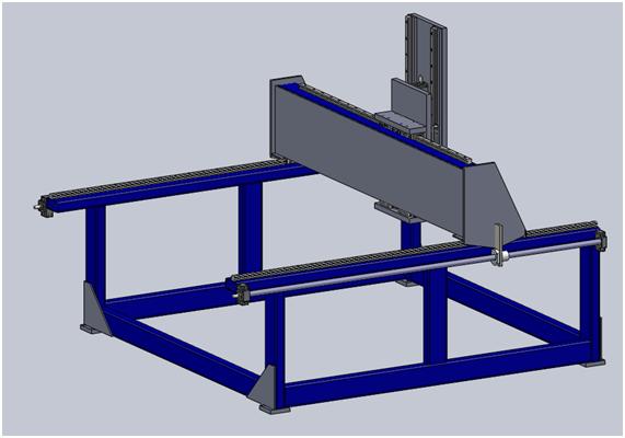 I would increase the size of the triangular plates and add some to the other two sides. You could also use diagonal pieces of box section to reinforce the X-axis. If you can add a piece of box section across the back between the X-axis rails that will make it a lot stronger.