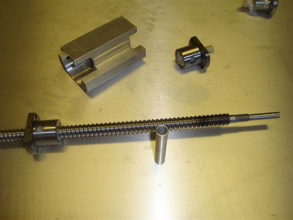 I cut the ballnut mount from 2.5" aluminium bar. Bored, drilled and tapped both ends to accommodate the ballnuts in a similar fashion to the X ballnut. Then some milling and finishing with flycutter. Next I machined the ballscrew and made a quick tube to fit over the end and transferred it into the ballnut. This enables fitting the ballnut without all the balls dropping out...
