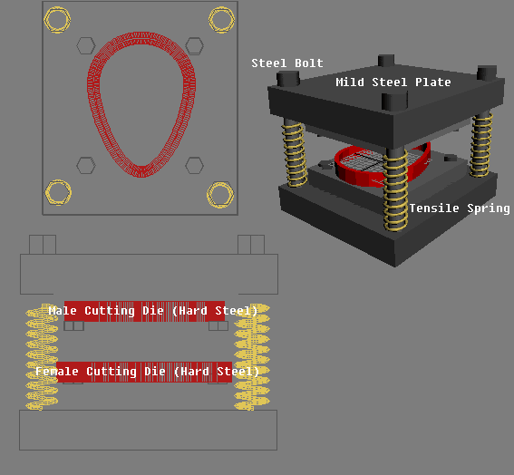 If the male and female have the bend shape in your last picture, bottom right but also the outline shape of the part the flypress with first cut it, then bend it and a set of spring loaded pins will finally punch the holes.