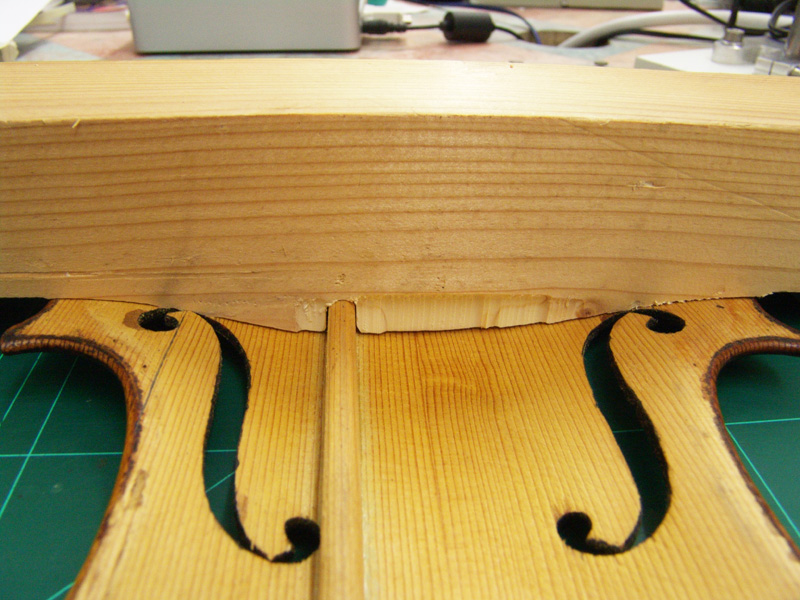 The following pictures show the scanning setup I built, including a motor drive for the laser, and a test cut I did of a patch for the inside of a violin top prior to doing the cello top patch. As you can see, the accuracy is only about 1 mm or so.