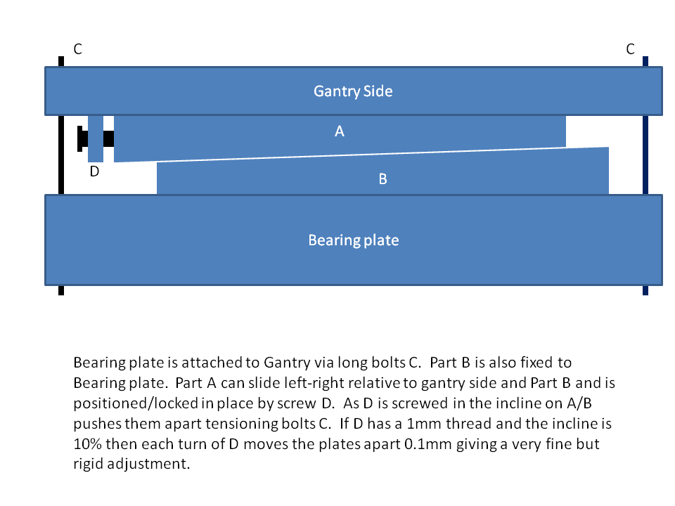 However, as Jonathan said it is tricky to get the exact spacing so that the bearings on the gantry and the rail on the frame align. I made the gantry about 1mm less wide than the frame/rails and then used shim plates (see here) to fill the space between the bearings (fixed to the rails) and the gantry side. With a firm wedge of shims in place, the bearings ran smoothly on the rails. At first I just used washers but the gantry moved with some resonance wobbling about. Having got the full shim plates in place today which support the bearings across the whole surface, it runs very nicely!