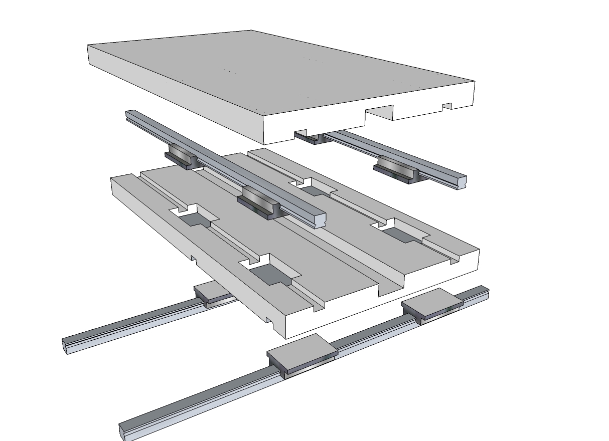 I'd put them above the top rail and below the lower rail for the above reason, and also because this increases the spacing of the blocks which is important to get maximum stiffness and it probably makes assembly easier. If However you can't afford the loss in travel thin entails, it's OK to have one between and the lower one below.