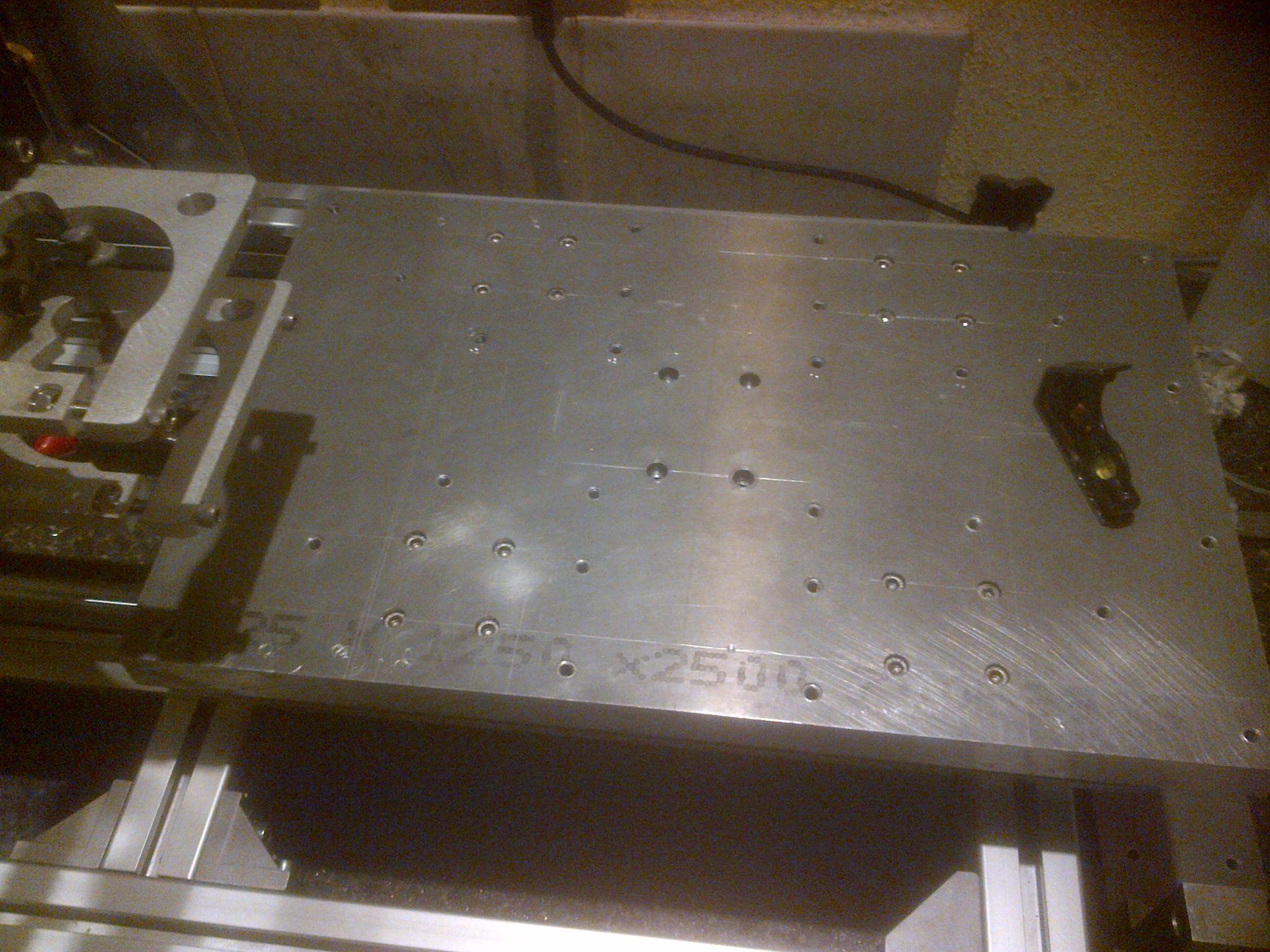 After trying a few jobs with wood, I found the spindle pushed so hard that the cutting bed began to bend like a banana !. It was a vacuum bed with only 4 drilled and tapped mounting holes. So I ordered a piece of aluminium 470mmX300X25 from ebay for a new cutting bed. I used "Emachineshop" and "Cambam" to create the counter-bores , mounting holes and 6mm holes for clamps then tapped them by hand. With my new Chinese spindle and endmills the machine "just about" managed to create the cutting table. Although I did have alot of messing about with large G-clamps to hold this down.