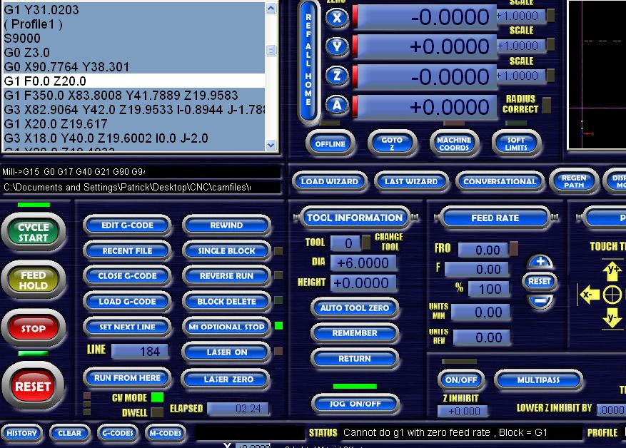 I designed a simple table clamp in cambam, and produced the G-code for Mach3. Mach3 sais "Cannot do G1 with 0 feedrate,block G1".