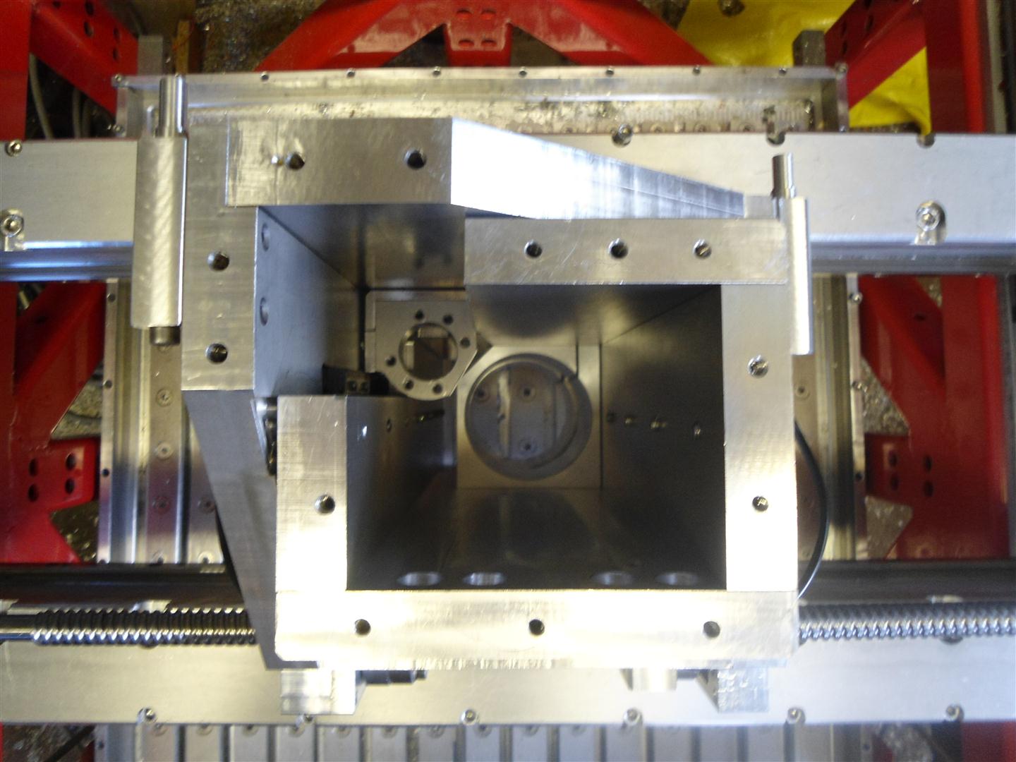 The Z-axis is a rectangular enclosure that contains a ballnut mount and two rails, the bearing blocks for which are mounted on to the Y-axis. Clearly the use of a box structure is substantially stronger than the standard single overhanging plate approach.